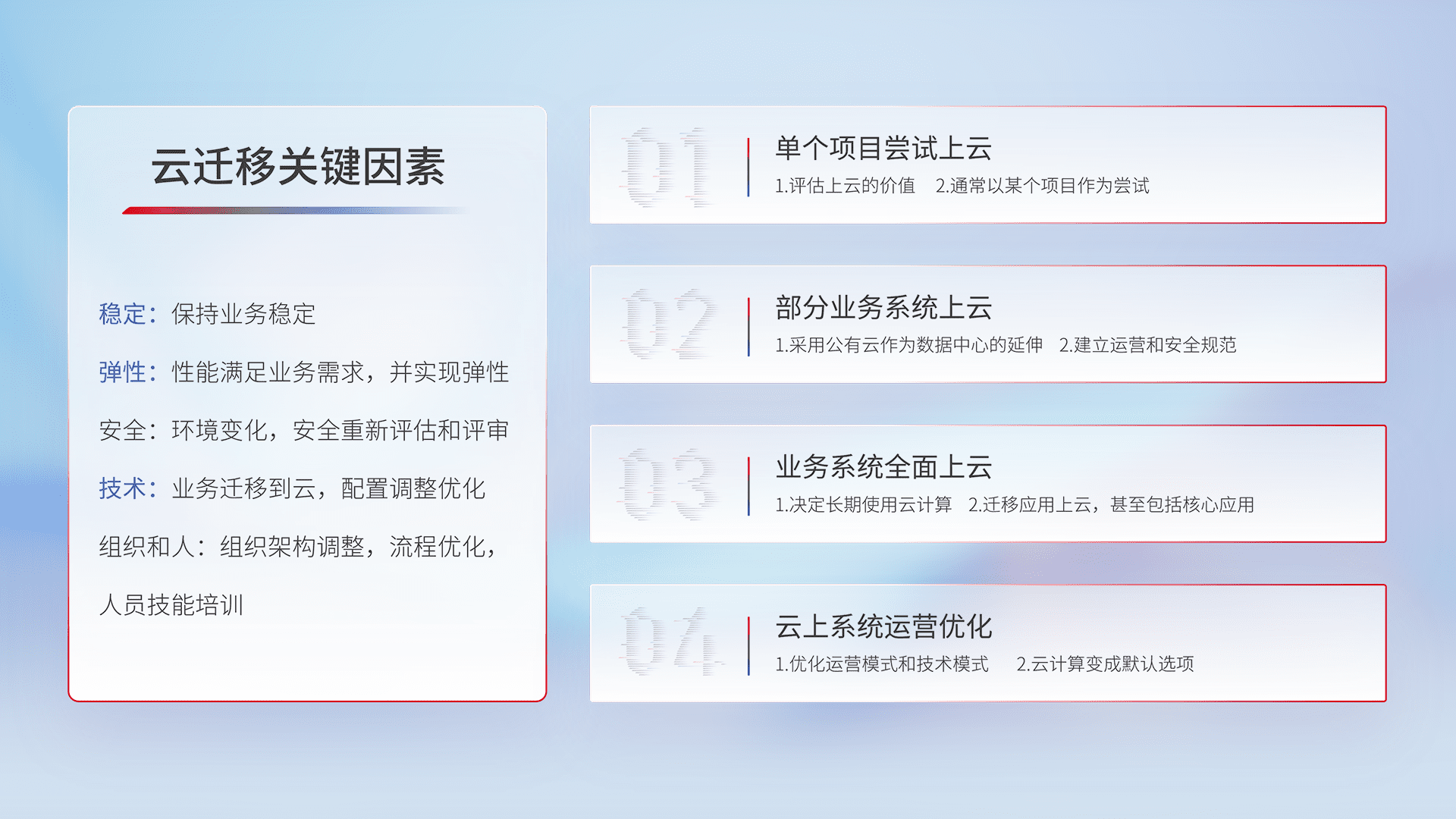 结合实际业务,,,从规划设计、、、、云平台选型、、、云原生改造、、数据迁移、、、、集成交付,,,迁移全过程为客户识别最佳上云路径,,做好风险识别管理,,设计网络架构、、、、身份权限、、、、安全审计合规、、、、操作审计、、、日志审计、、监控告警策略、、、多站点容灾设计等,,,,对云上基础设施进行整体规划,,,提升IT治理水平,,,,以满足弹性、、高可用、、、、高性能的需求。。。。